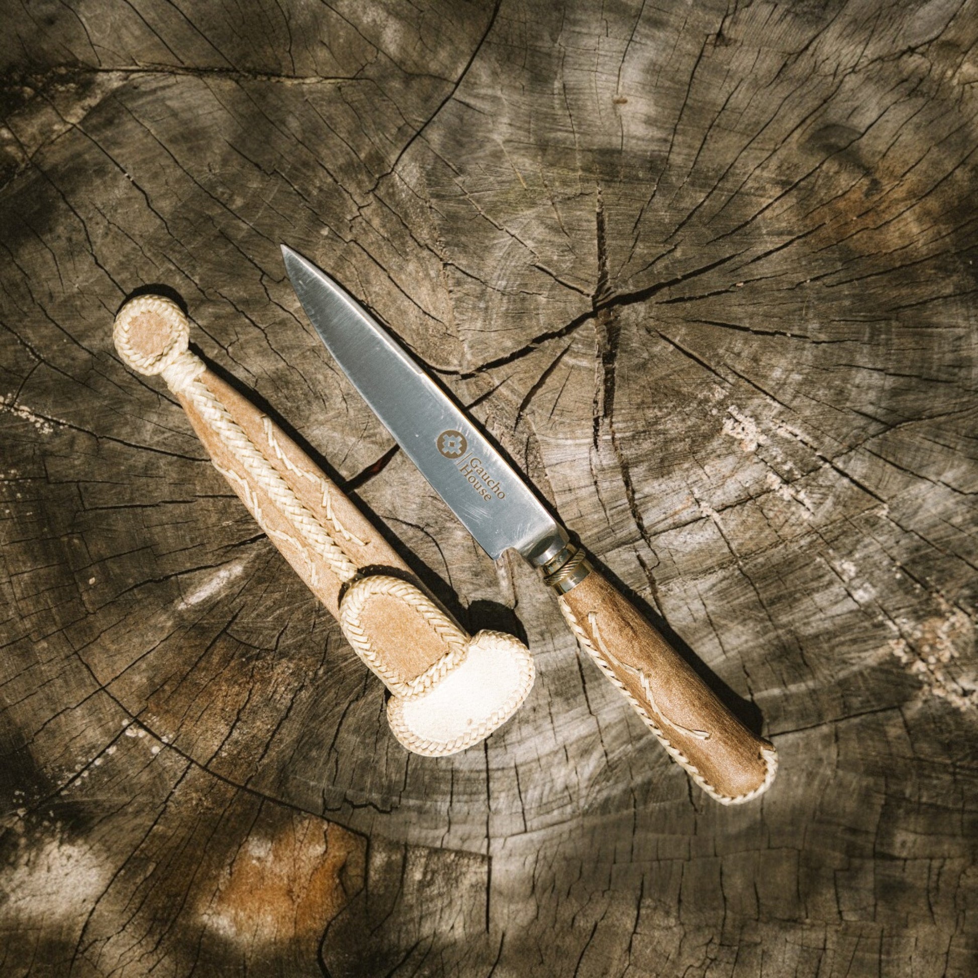 What truly sets this piece apart is its distinctive construction: both the handle and sheath are crafted entirely from rawhide, echoing the same natural material and artisanal spirit found in our Crudo Gaucho Belt.