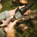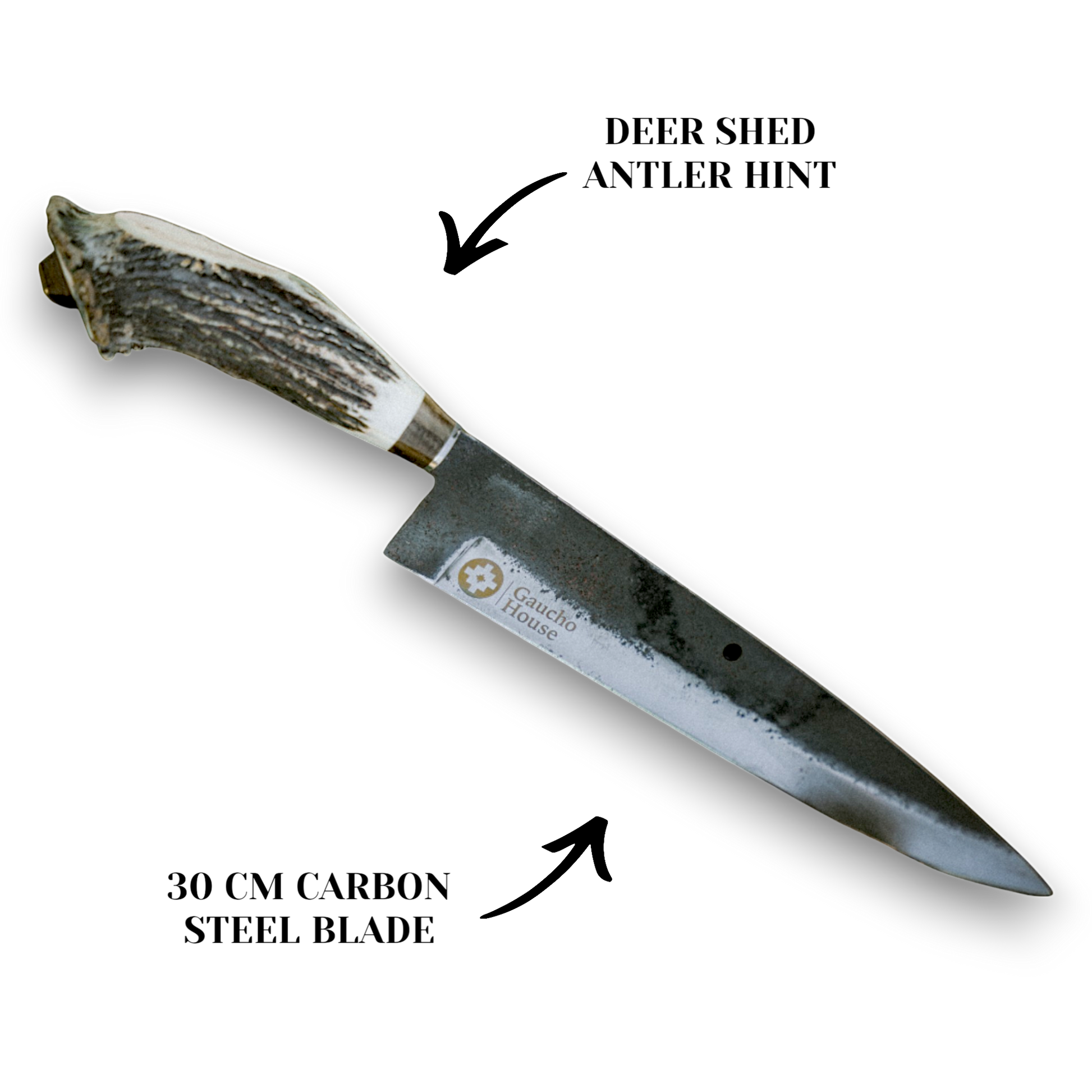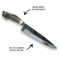 This handcrafted field knife features a 30 cm high-carbon steel blade and a naturally shed deer antler handle, offering strength, grip, and rustic elegance.