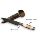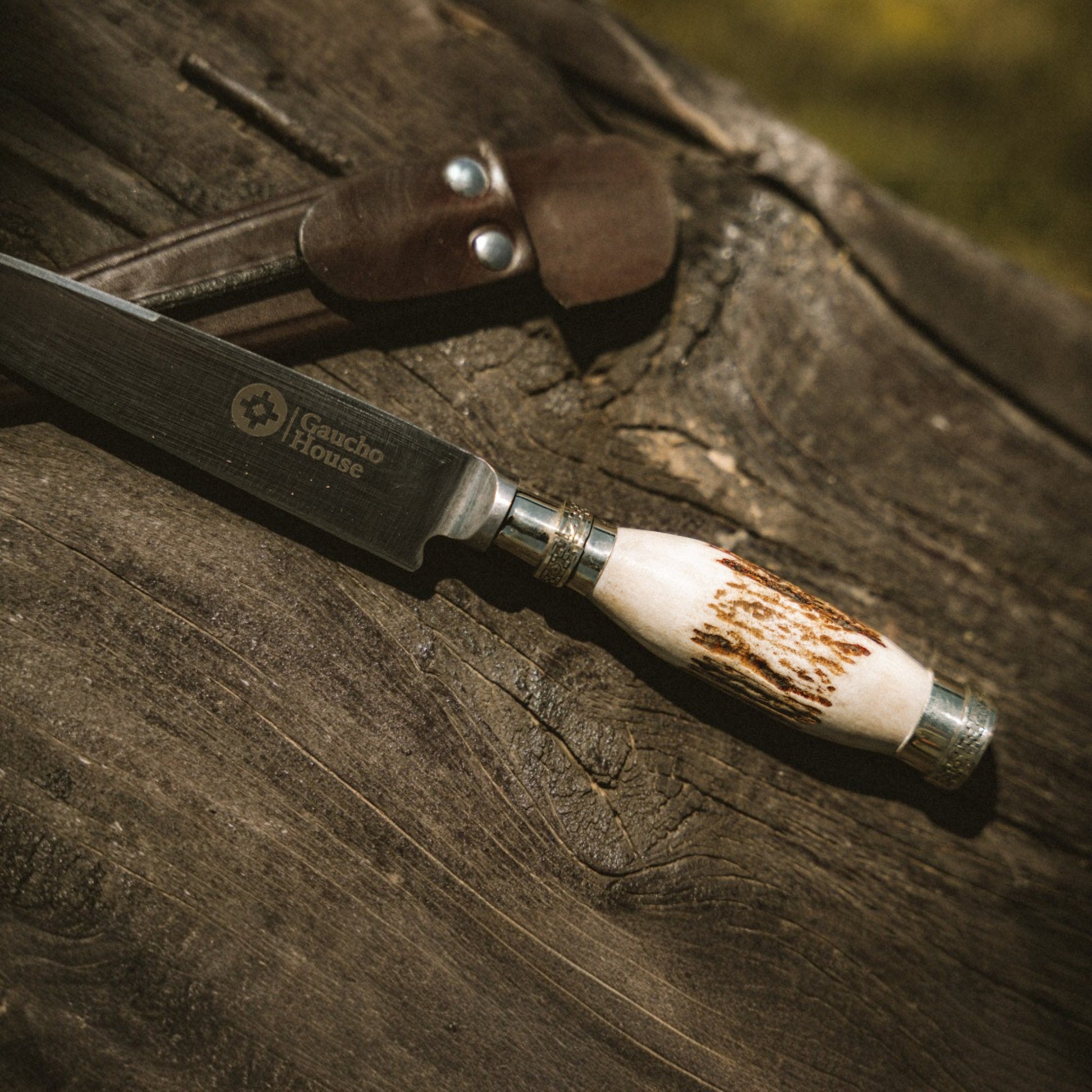 Crafted for enduring strength and elegance, DIENTE DE LA PAMPA KNIFE carries a handle that is sculpted from genuine red deer shed antler and beautifully accented with polished alpaca fittings. Its robust 14 cm stainless-steel blade is precision-forged and heat-treated to exceptional hardness and corrosion resistance, ensuring a razor-sharp edge that stands the test of time. Alpaca is a zinc, copper and nickel alloy, also knownas German silver or white metal. All Guacho House knives come in a full leather sheath.