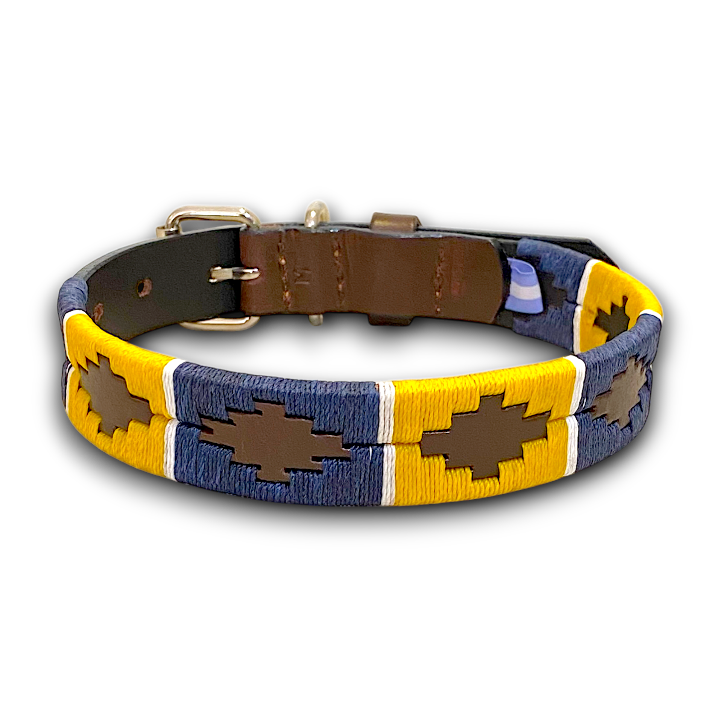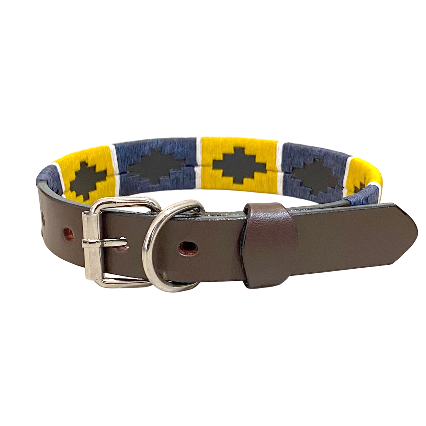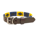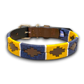 The Primavera Dog Collar is carefully handcrafted and handstitched with precision. The combination of navy and yellow gives it a classic and stylish look. Made with high-quality waxed threads, this collar ensures your dog's safety while providing a comfortable fit. Elevate your pet's style with this unique and durable collar.