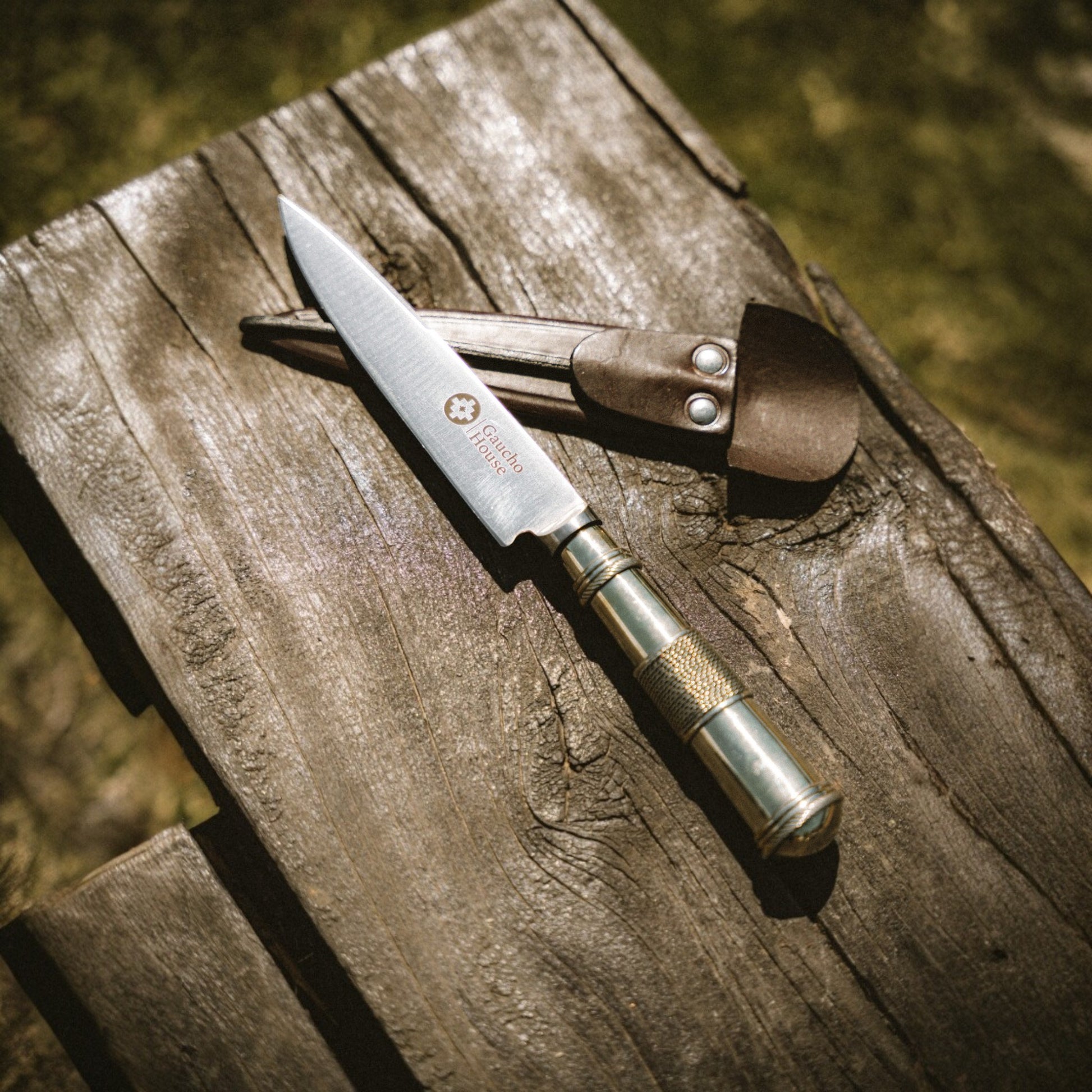 This fine full metal knife carries a hint that is artfully wrapped in fine stainless-steel wire, providing an exceptional non-slip grip and a touch of industrial flair. Polished alpaca (German silver) collars at the bolster and end cap catch the light with a warm, silver-white gleam, elegantly contrasting the blade’s satin finish. The stainless steel blade length is 14cm. Full knife lenght is 25cm. All Guacho House knives come in a full leather sheath.