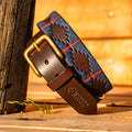 This bold Gaucho House's polo belt is a perfect combination of a powerful navy blue and sharp red threads. Behold this exceptional belt adorned with our iconic Pampa Diamond motif—an ancient Aztec pattern meticulously crafted to mirror the breathtaking grandeur of the Andes mountain range. This awe-inspiring natural wonder has profoundly impacted the lives of countless South American locals.