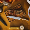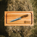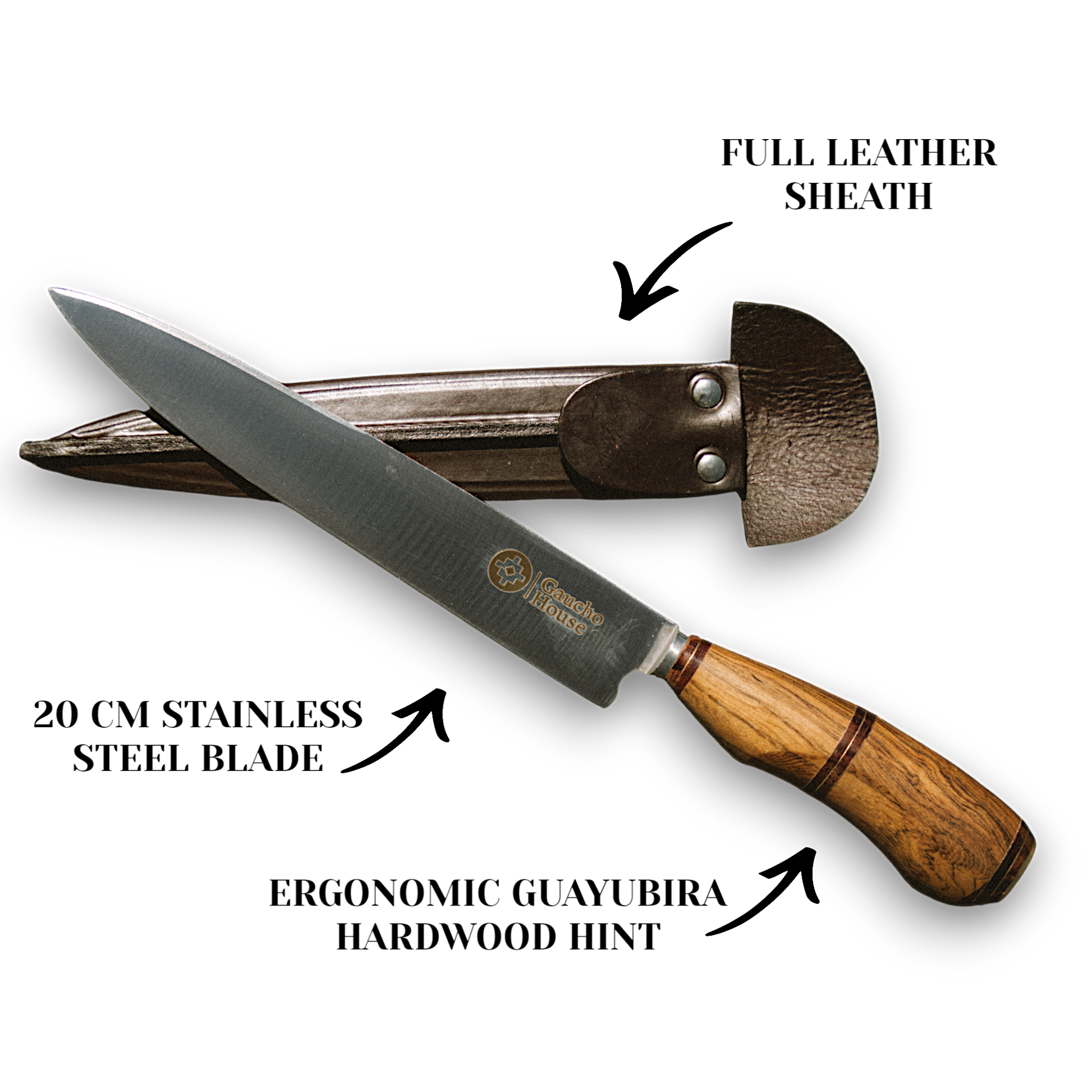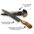 Hand-carved from select Guayubirá hardwood, its gently contoured grip fits your hand naturally—minimizing wrist fatigue even during extended use. The POTRERO ERGONOMICO KNIFE has a 20 cm stainless-steel blade is precision-forged and expertly heat-treated for exceptional hardness, razor-sharp edge retention, and enduring corrosion resistance. Rich bronze accents at the bolster and pommel lend a subtle, burnished sheen and perfect the knife’s ergonomic harmony. Full size of knife is 32 cm. It comes with a full leather sheath.