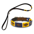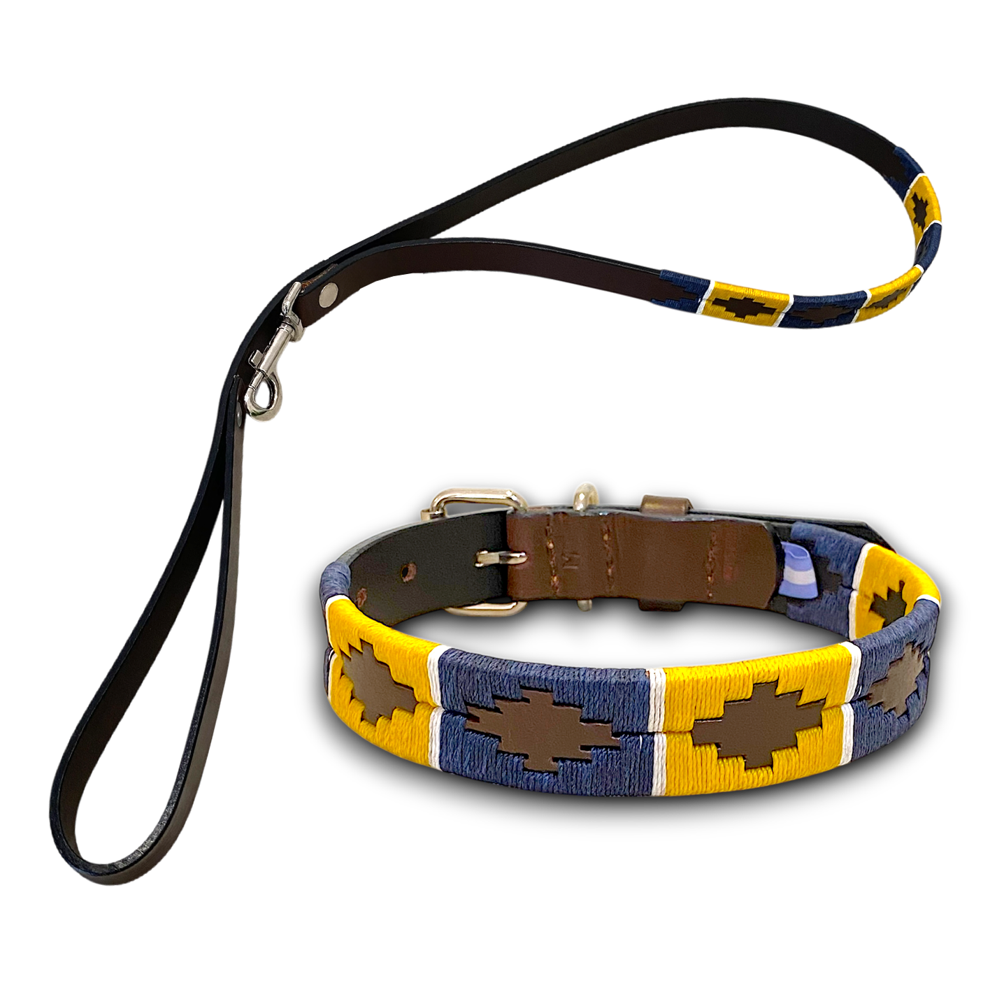 The Esmeralda dog accessory bundle is carefully handcrafted and handstitched with precision. The combination of navy and yellow gives it a classic and stylish look. Made with high-quality waxed threads, this collar ensures your dog's safety while providing a comfortable fit. Elevate your pet's style with this unique and durable collar.
