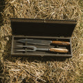 The knife and fork feature 20 cm stainless steel blades and prongs, forged and heat-treated for lasting sharpness, strength, and corrosion resistance. Measuring 32 cm in total length with 12 cm handles, the set is perfectly balanced for grilling and carving.
